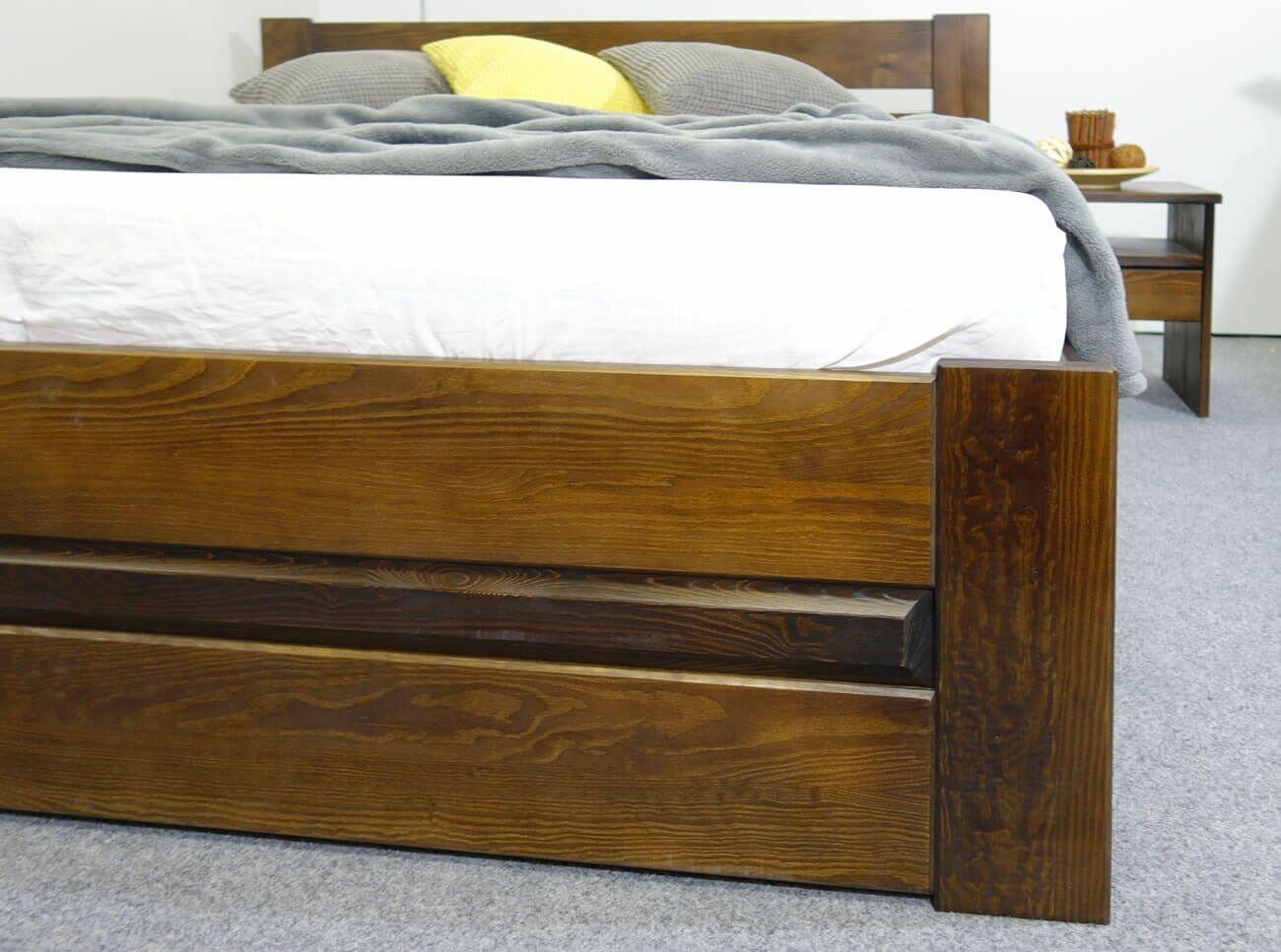 Celkový vzhled této manželské postele je vskutku povedený. Hlavové čelo postele je v elegantním designu s jednoduchým podélným průřezem. Rám čela u nohou obsahuje ozdobně frézovanou výplň, díky níž postel vypadá velmi zajímavě. Všechny hrany jsou hezky a precizně zpracovány a jsou velmi příjemné na dotek. Povrch dřeva je kvalitně nalakován vodouředitelným atestovaným lakem, takže je příjemně hladký.